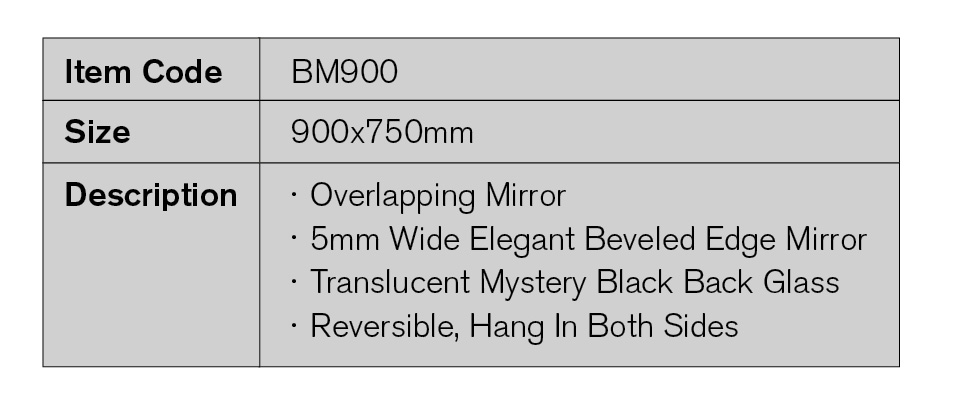 Home / Shaving Cabinets & Mirrors / Mirrors / BM900 BM900 Item Code BM900 Size 900x750mm Description Overlapping Mirror 5mm Wide Elegant Beveled Edge Mirror Translucent Mystery Black Back Glass Reversible, Hang In Both Sides Category: Mirrors Product ID: 2503 Reviews (0) Reviews There are no reviews yet. Be the first to review “BM900” Cancel replyYour email address will not be published. Required fields are marked *Your rating * Rate… Perfect Good Average Not that bad Very poor Your review *Name * Email * Save my name, email, and website in this browser for the next time I comment. Related products WM900 Click Here BM1200 Click Here WM600 Click Here BM600 Click Here