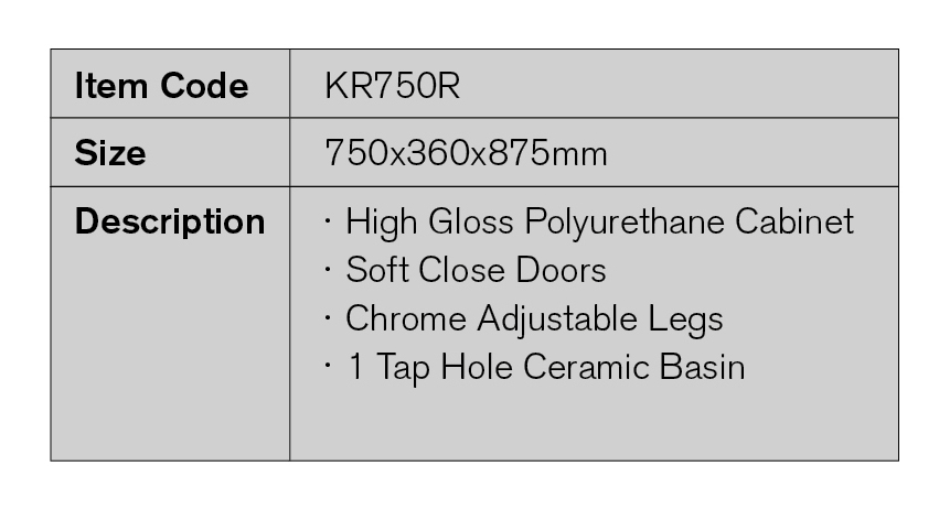 Home / Vanities / Narrow Ensuite / KR750R KR750R Item Code KR750R Size 750x360x875mm Description High Gloss Polyurethane Cabinet Soft Close Doors Chrome Adjustable Legs 1 Tap Hole Ceramic Basin Categories: Narrow Ensuite, Vanities Product ID: 3406 Reviews (0) Reviews There are no reviews yet. Be the first to review “KR750R” Cancel replyYour email address will not be published. Required fields are marked *Your rating * Rate… Perfect Good Average Not that bad Very poor Your review *Name * Email * Save my name, email, and website in this browser for the next time I comment. Related products SL750 Click Here SD1200 Click Here DM1200 Click Here SB1200 Click Here
