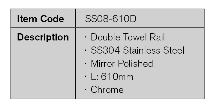 Home / Bathroom Accessories / SS08-610D SS08-610D Item Code SS08-610D Description Double Towel Rail SS304 Stainless Steel Mirror Polished L:610mm Chrome Category: Bathroom Accessories Product ID: 2966 Reviews (0) Reviews There are no reviews yet. Be the first to review “SS08-610D” Cancel replyYour email address will not be published. Required fields are marked *Your rating * Rate… Perfect Good Average Not that bad Very poor Your review *Name * Email * Save my name, email, and website in this browser for the next time I comment. Related products SS03-B Click Here SS05 Click Here SS05-B Click Here RS01-610 Click Here